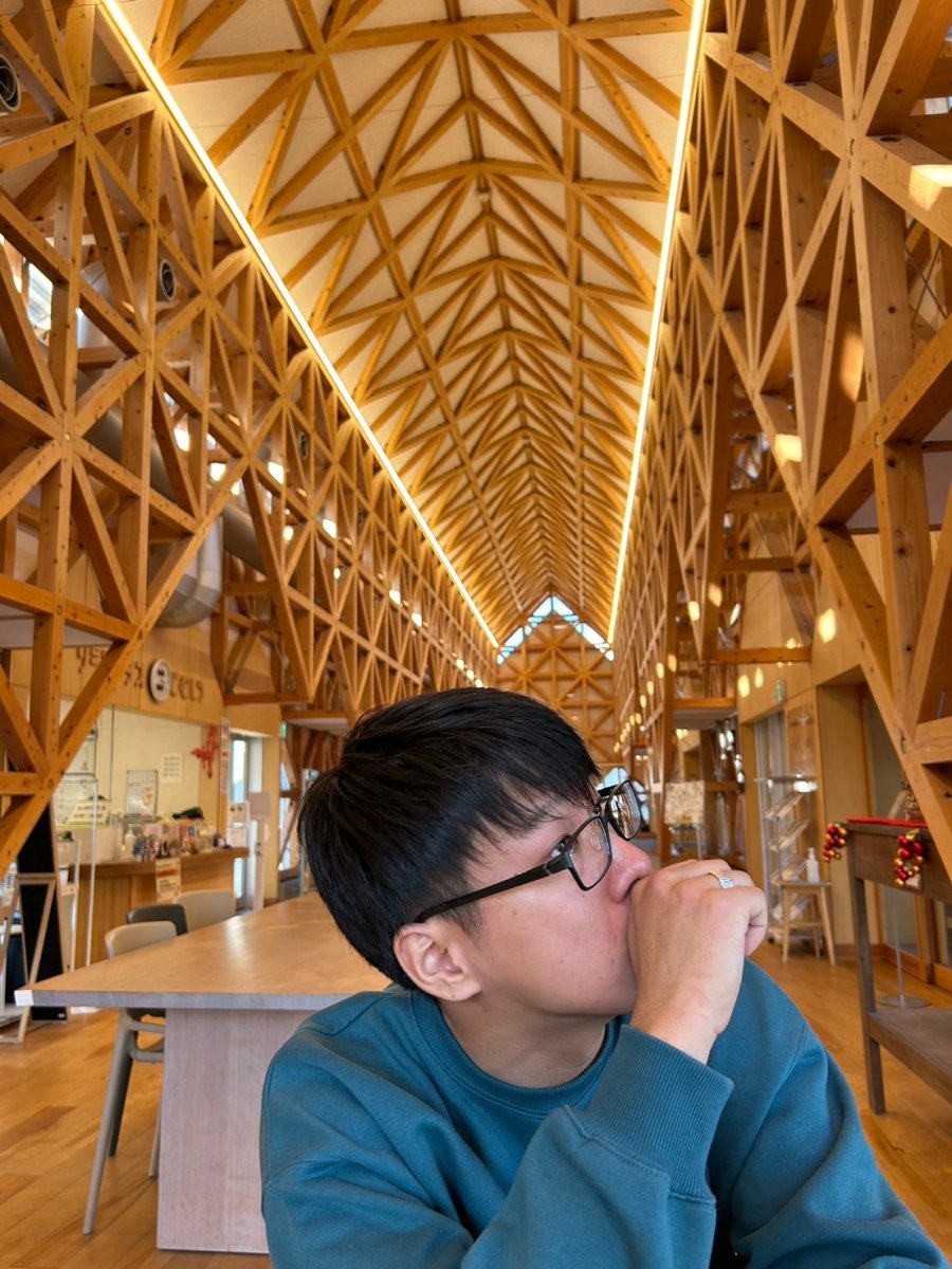 この建物が素敵で、木造のトラス構造で広い空間を支えています。