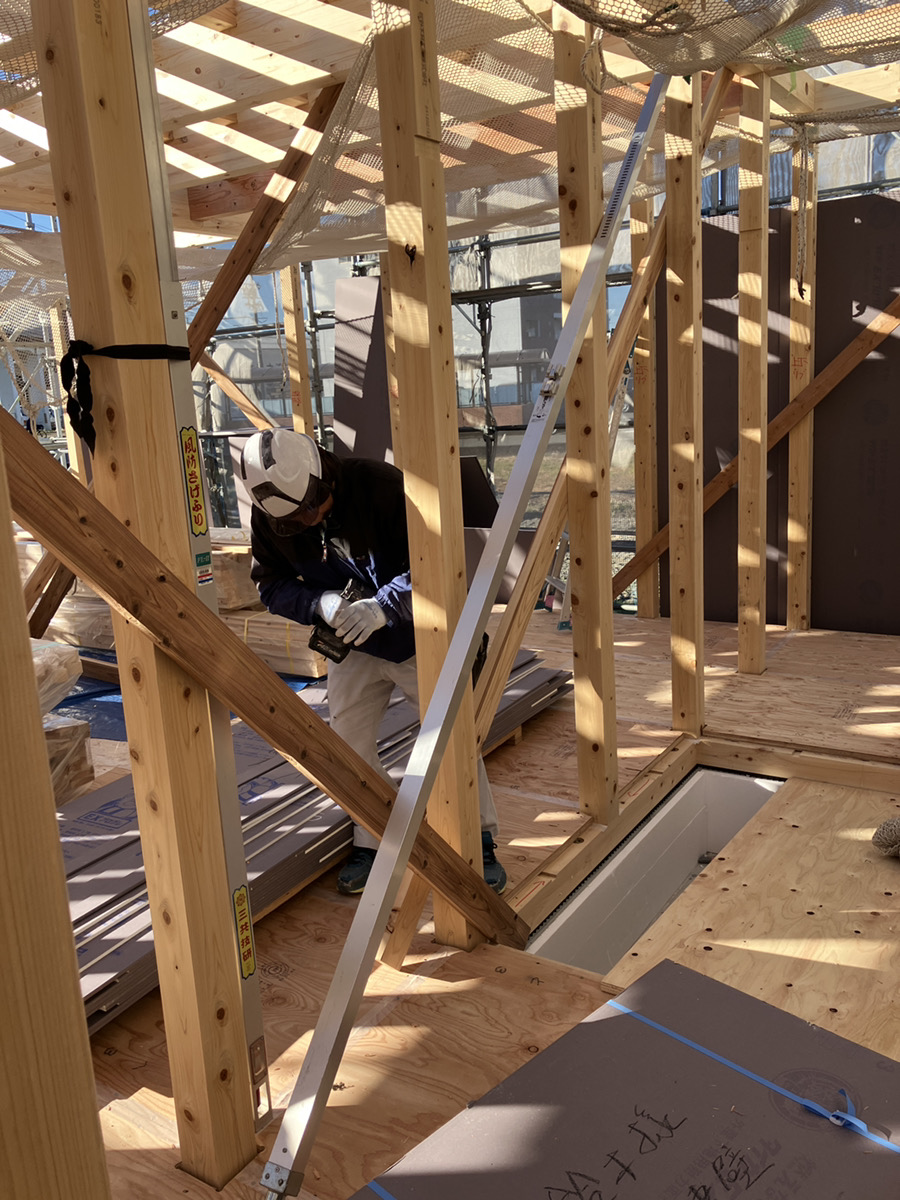 実は上棟時に下げ振りと屋起こしという道具を使用して柱を垂直にしているんです。