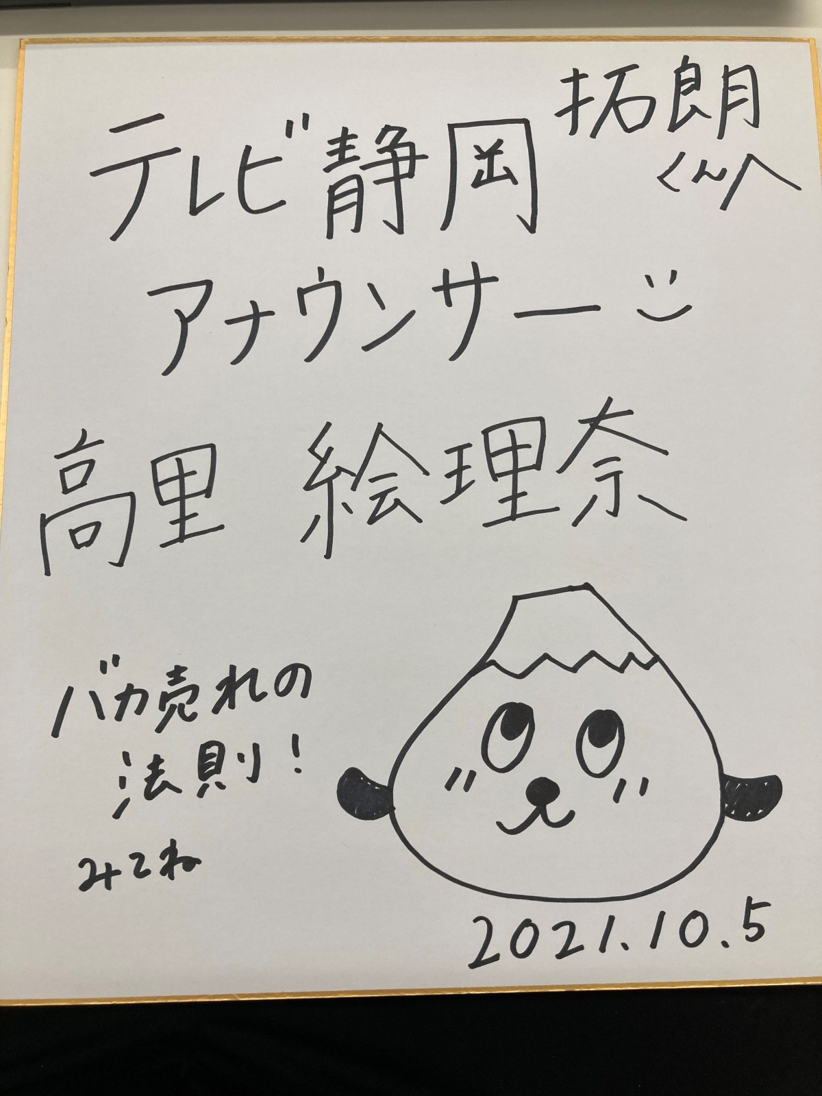 テレビ静岡アナウンサー 高里 絵理奈アナウンサーからサイン頂きました。