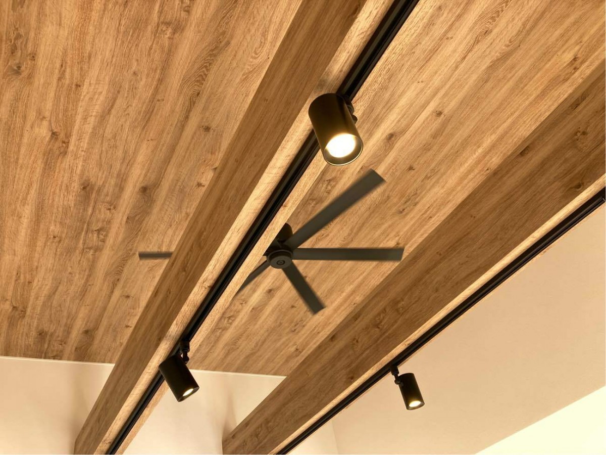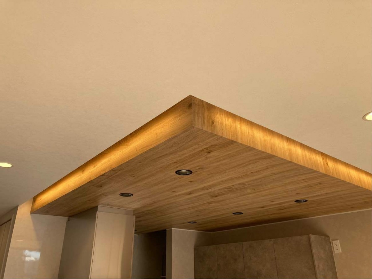天井の高さを上げて、照明とファンの設置をしています。