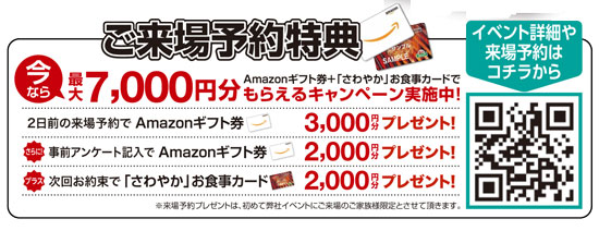 ①2日前までの来場予約でAmazonギフト券3,000円分プレゼント