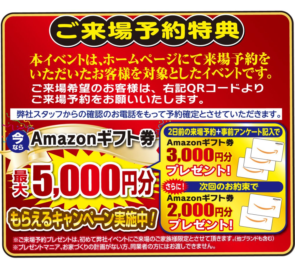 ①2日前までの来場予約+事前アンケート記入でAmazonギフト券3,000円分