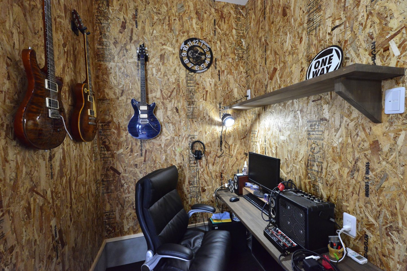 壁全体にOSBボードを採用したことで、カッコよさと何でも飾れるインテリアウォールに。ガレージの一角にはワークスペースを設け、まさに「俺の書斎」を実現しました。 -