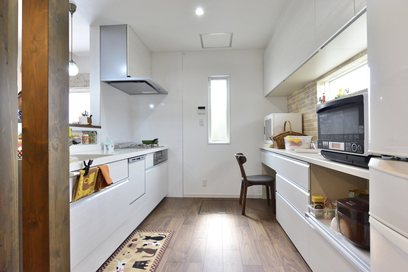 背面のカウンターは2m70㎝とし、キッチン用品の収納はもちろん、新しいレシピを書き留めれるようなワークスペースとしても使えます。
