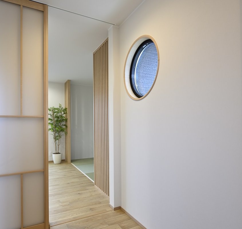 入口を入った先にはかわいい丸窓と、和を感じさせる引き戸を選びました。