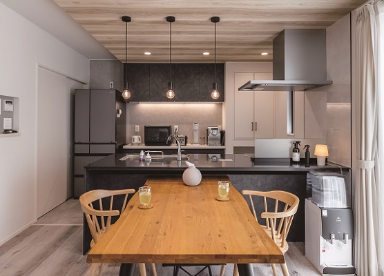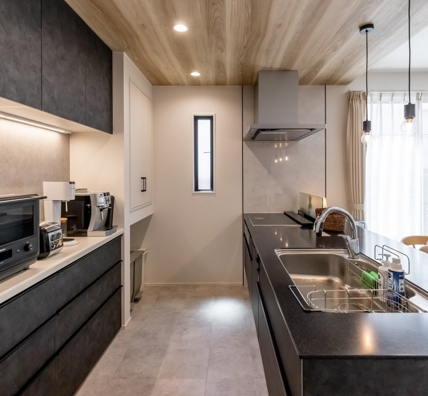 また、主人の希望の黒いキッチンに合わせて冷蔵庫やキッチン家電も黒、グレーで統一しました。 -