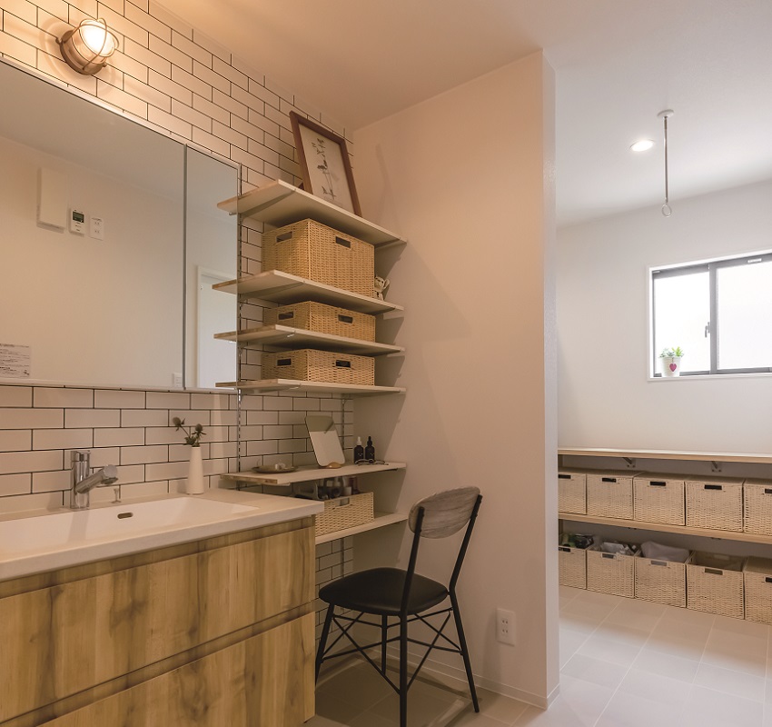 半造作の洗面台には収納用可動棚を工夫したドレッシングコーナーを作りました。