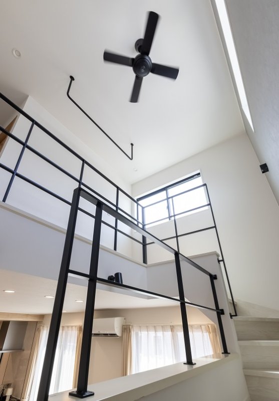 アイアンの手すりをアクセントにした吹き抜けのリビング階段もお気に入りです。