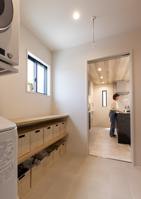 奥のランドリースペースは広さ十分なカウンター、収納、乾太くんがあります。