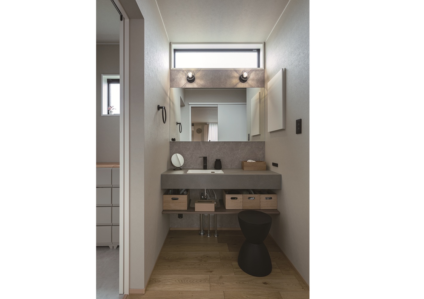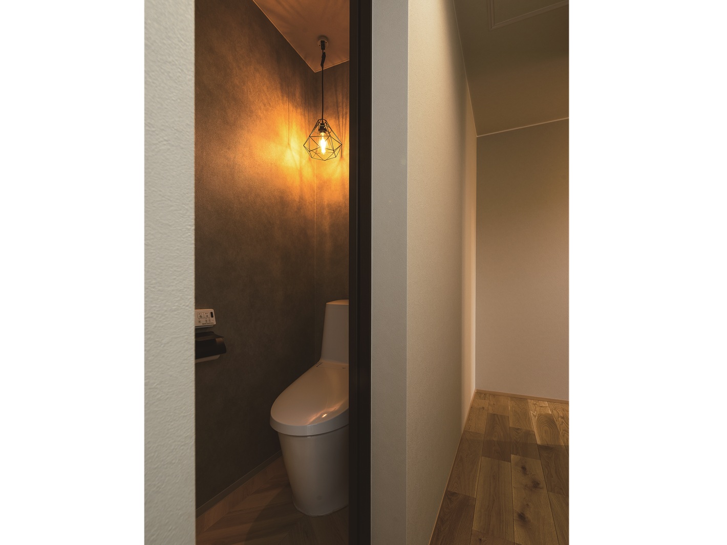 トイレは濃いグレーのクロスと暖かな照明で、ほっと落ち着く空間にしました。