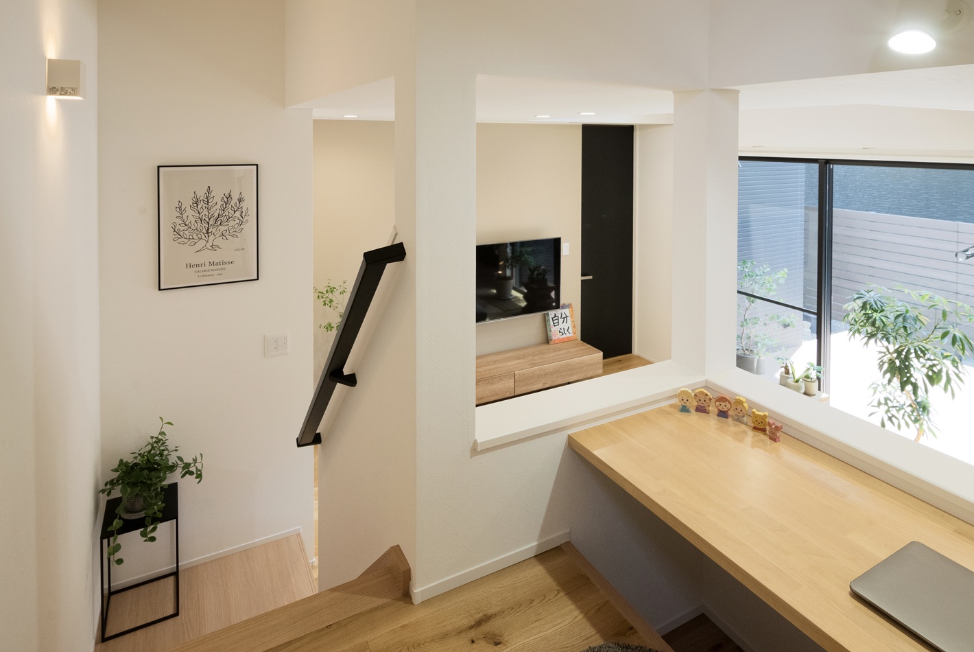 ご主人の要望で、掘りごたつスタイルの造作デスクを備えたスキップフロアを設けた。家族の気配を感じながら、思い思いの時間を過ごせる