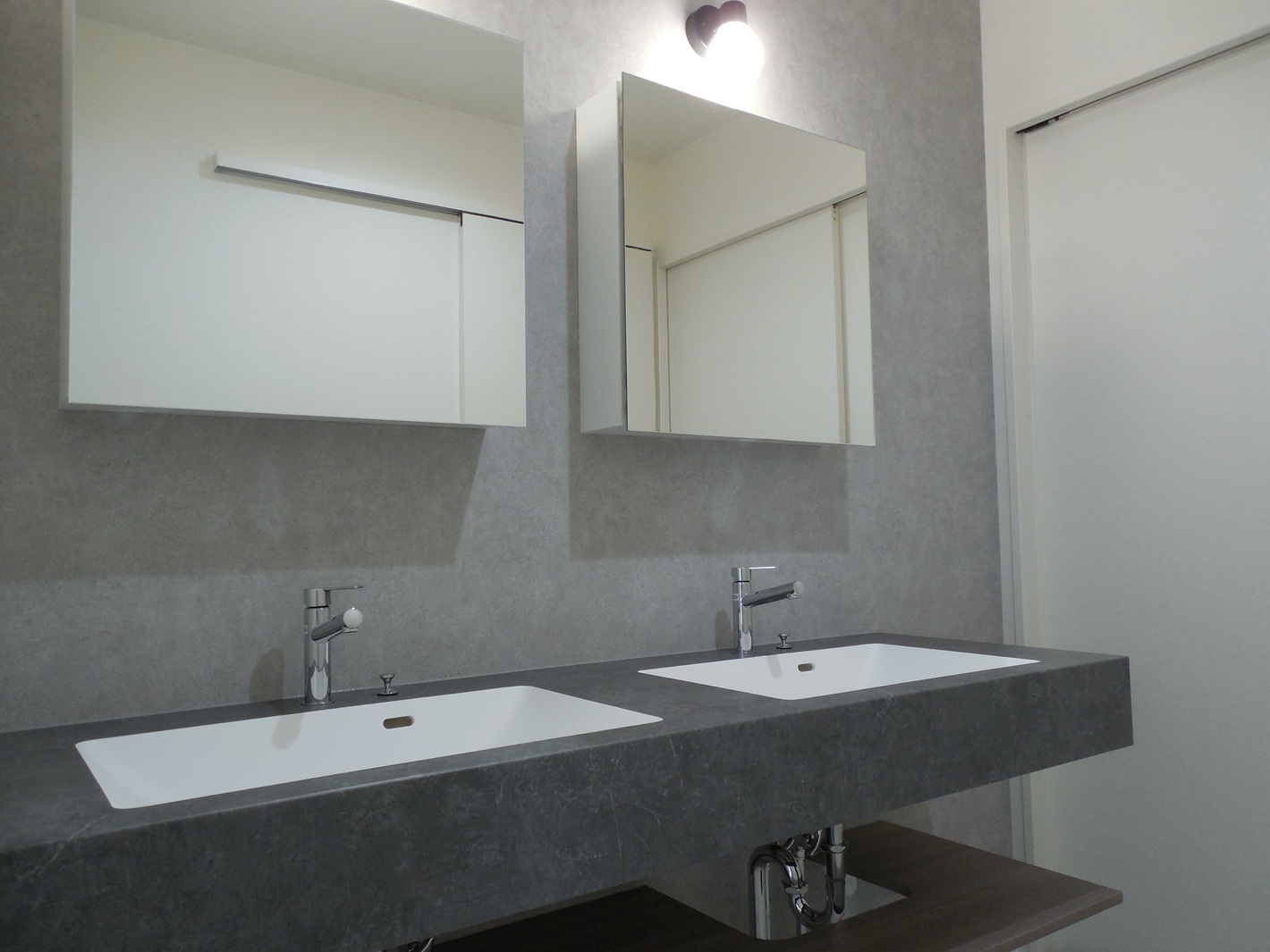 洗面台を使う時間がかぶっても、ボウルが2つあってそれぞれが自分の身支度をなんのストレスもなくできるので採用して良かったと思います。