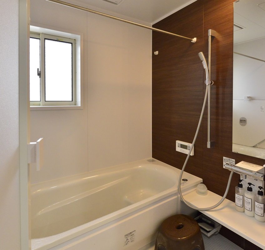 お風呂は開放的で、背面を木目調にして、明るい仕上がりにしました。