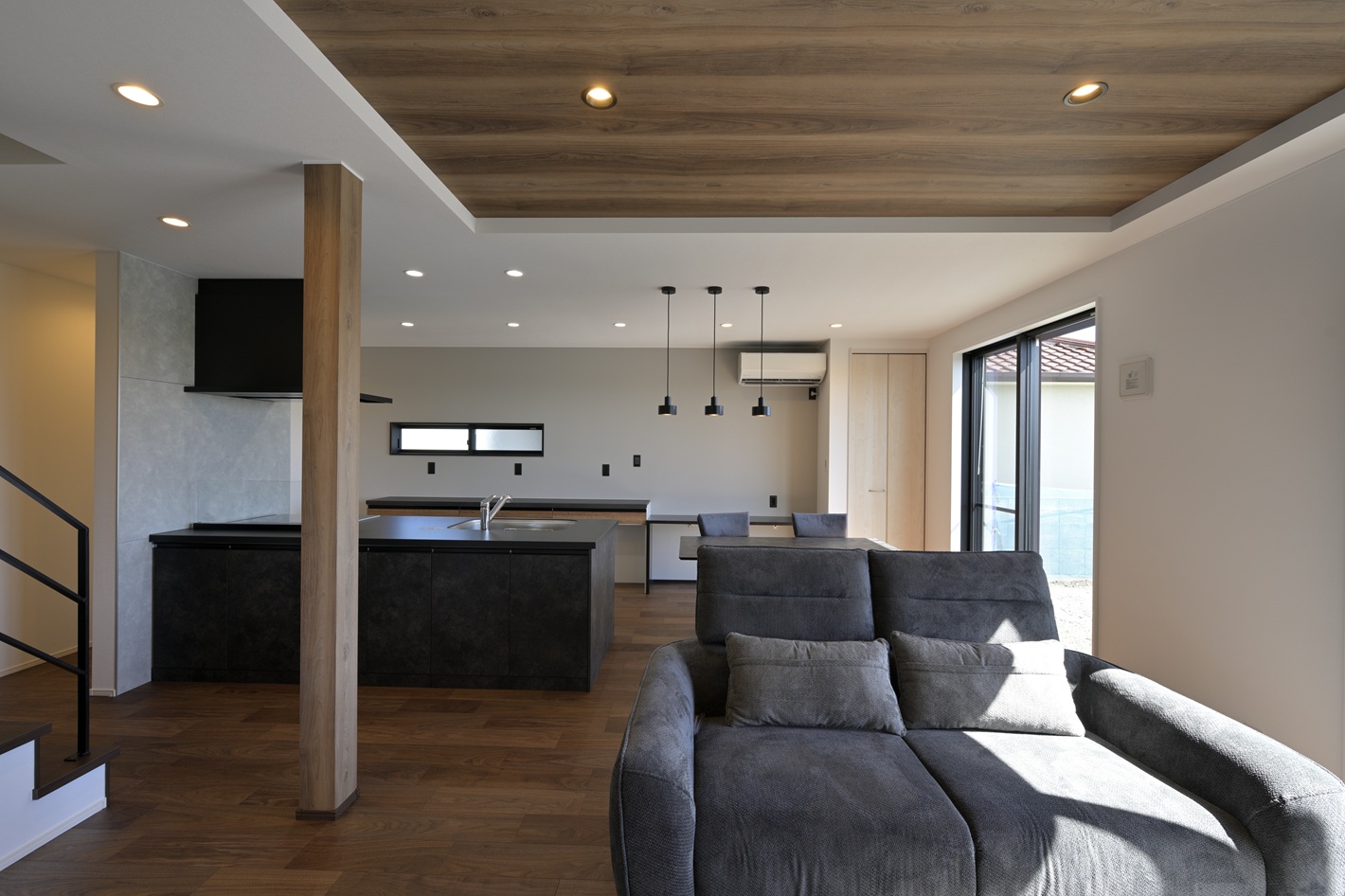 黒と木目でまとめた22帖広々LDKのお家