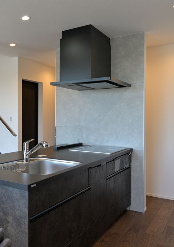 キッチンやアイアン手摺などポイントで黒を使うことでご夫婦こだわりの「かっこよさ」が表現されています。