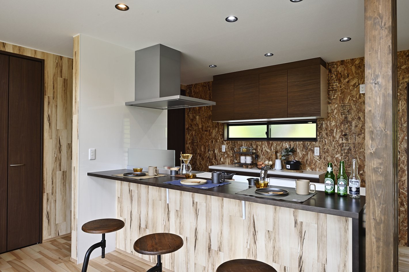 キッチン周りは、バーのような雰囲気をイメージしつつ、床は木目と淡い色合いが特徴のイタヤカエデ材で、明るさと優しさを演出しました。