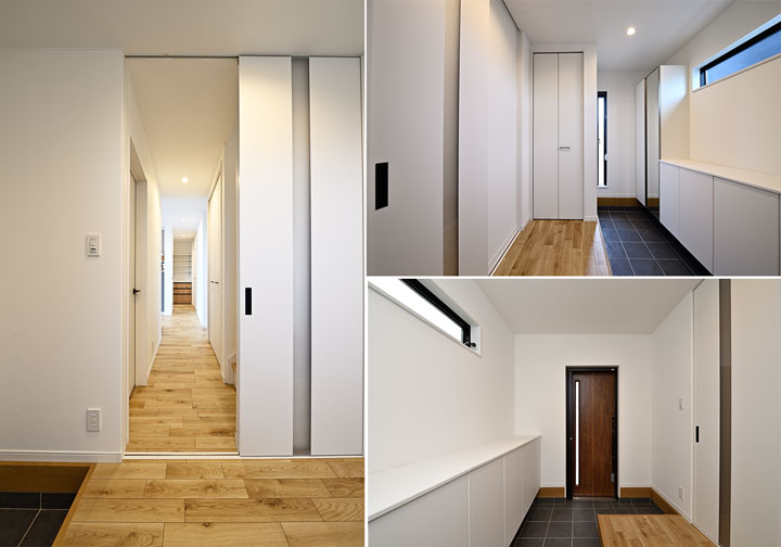 L型にレイアウトされた広々玄関にはご家族皆様の靴がたっぷり収納できるシューズBOXを設けました。