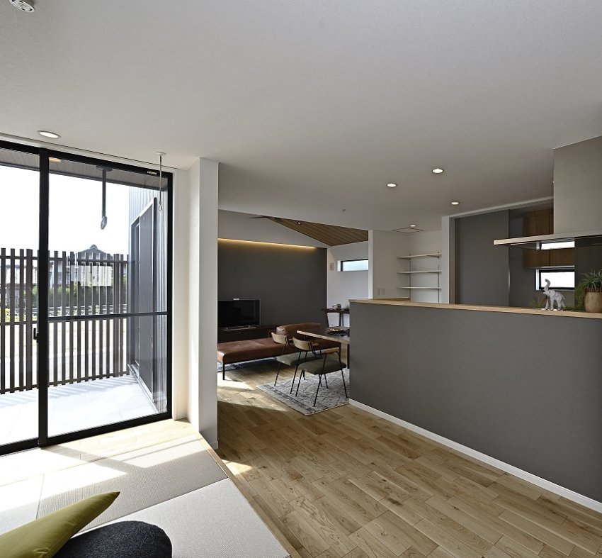 休日にはご友人を呼んでBBQを楽しむ”パティオ”や、開放的なリビング空間を演出するための”勾配天井”、目の届く位置で思いっきりお子様に遊んでもらえるキッチン前の”畳コーナー”、そしても何といってもご主人のご趣味であるバイクの為に作った”ガレージ”は男子の憧れです。