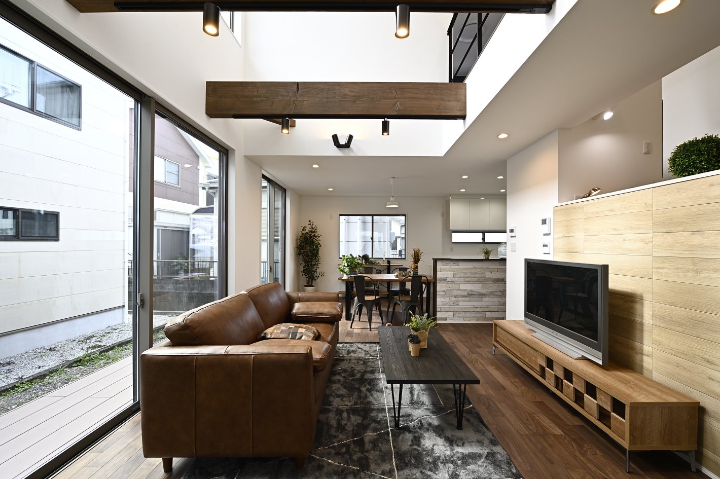 吹抜け空間には、大きな窓やトップライトを設け、いつも明るいリビングを実現しました。 -