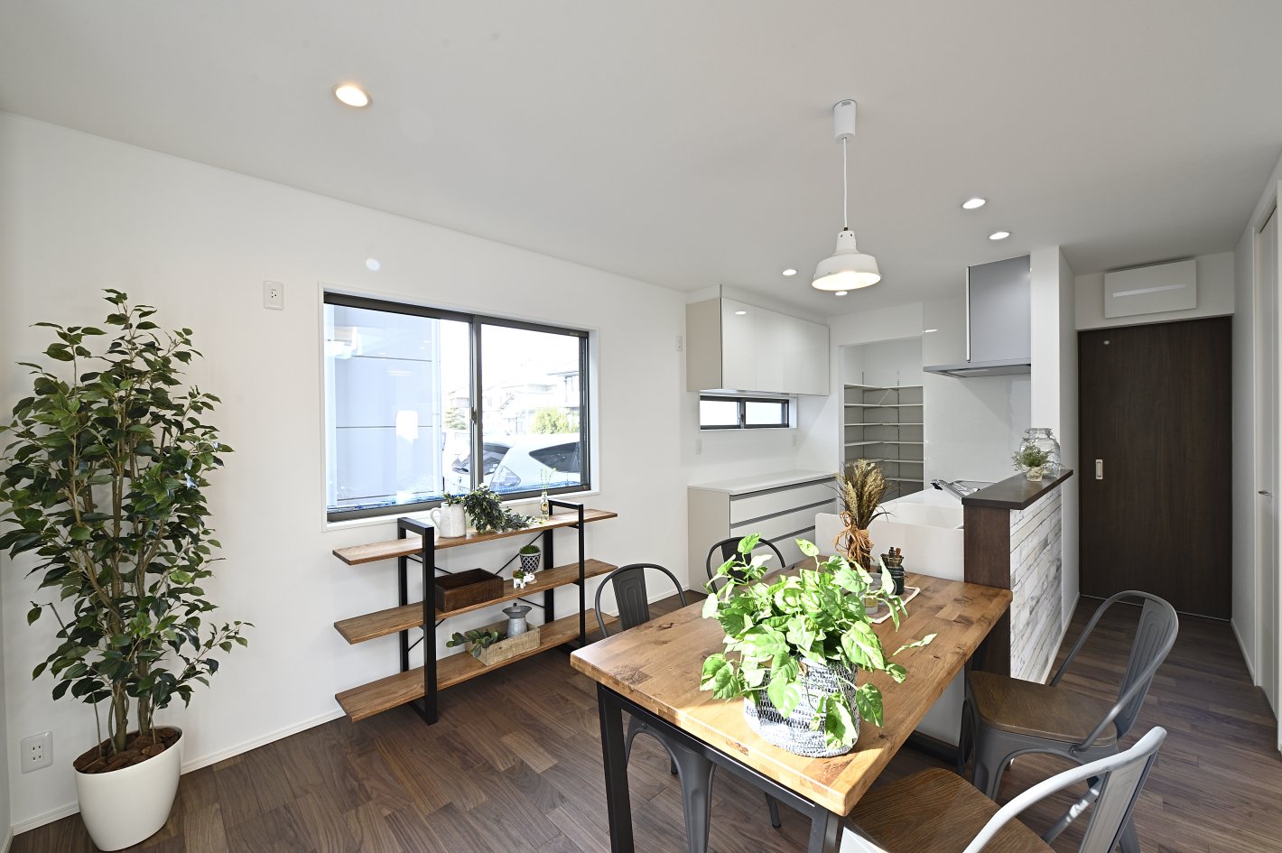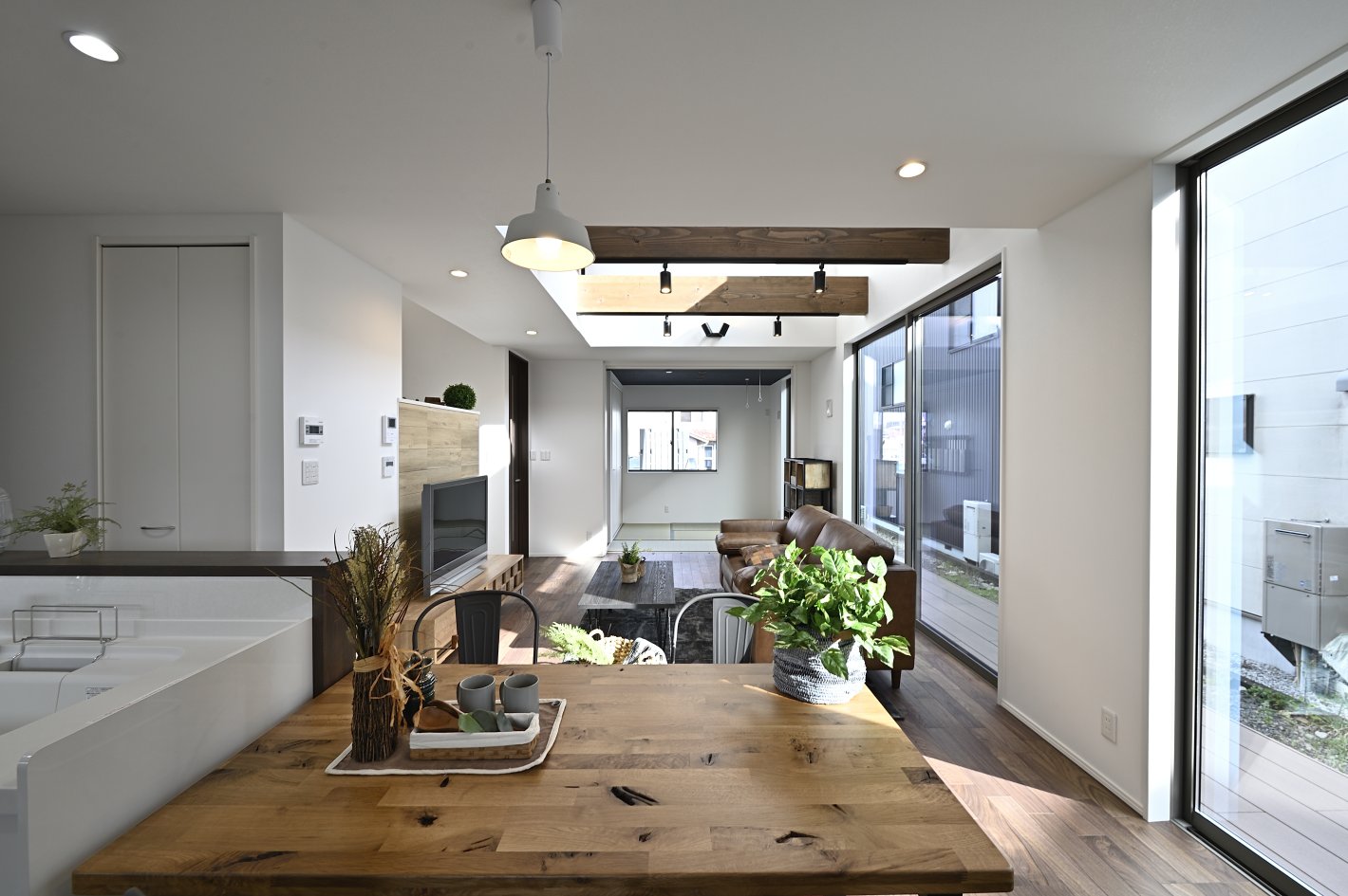 「横に広がるウッドデッキ」、「スキップフロアの下にある収納スペース」、「玄関の横にある小物置場として利用できる棚」「天窓部に夏場の強い日差しをカットできる高遮熱の電動カーテン」など、自由設計ならではのこだわり満載です。