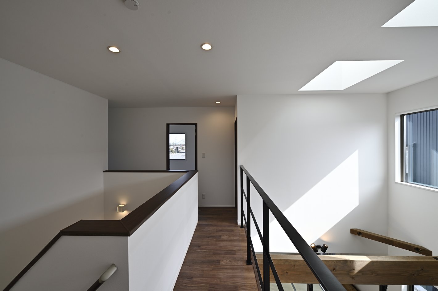 2Fには、吹抜けとつながる廊下がありますが、アイアンとガラスのパネルの手摺でとても解放感のあるホールとなりました。