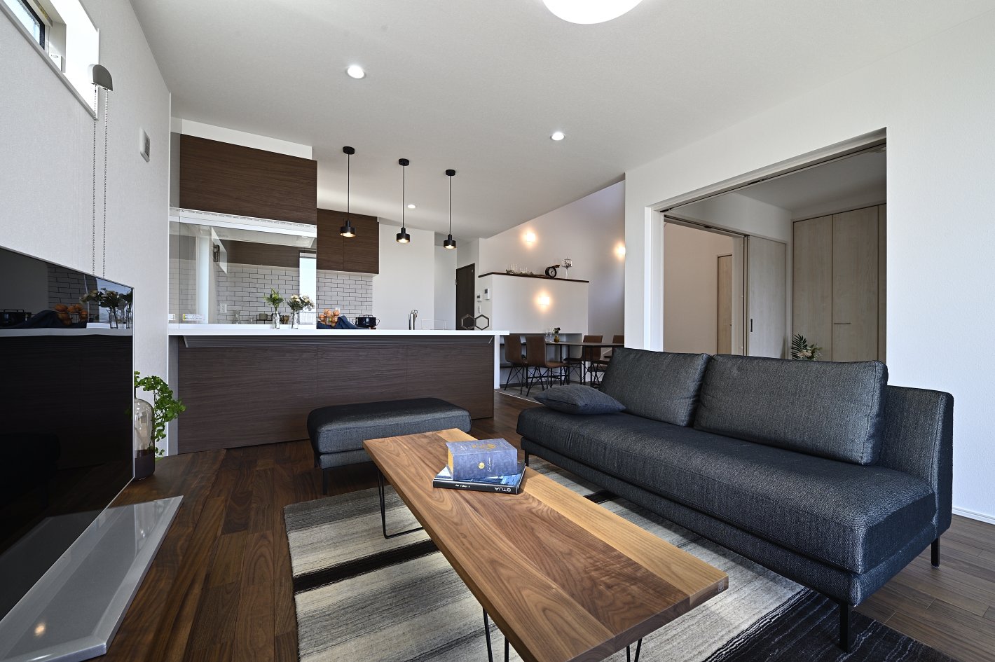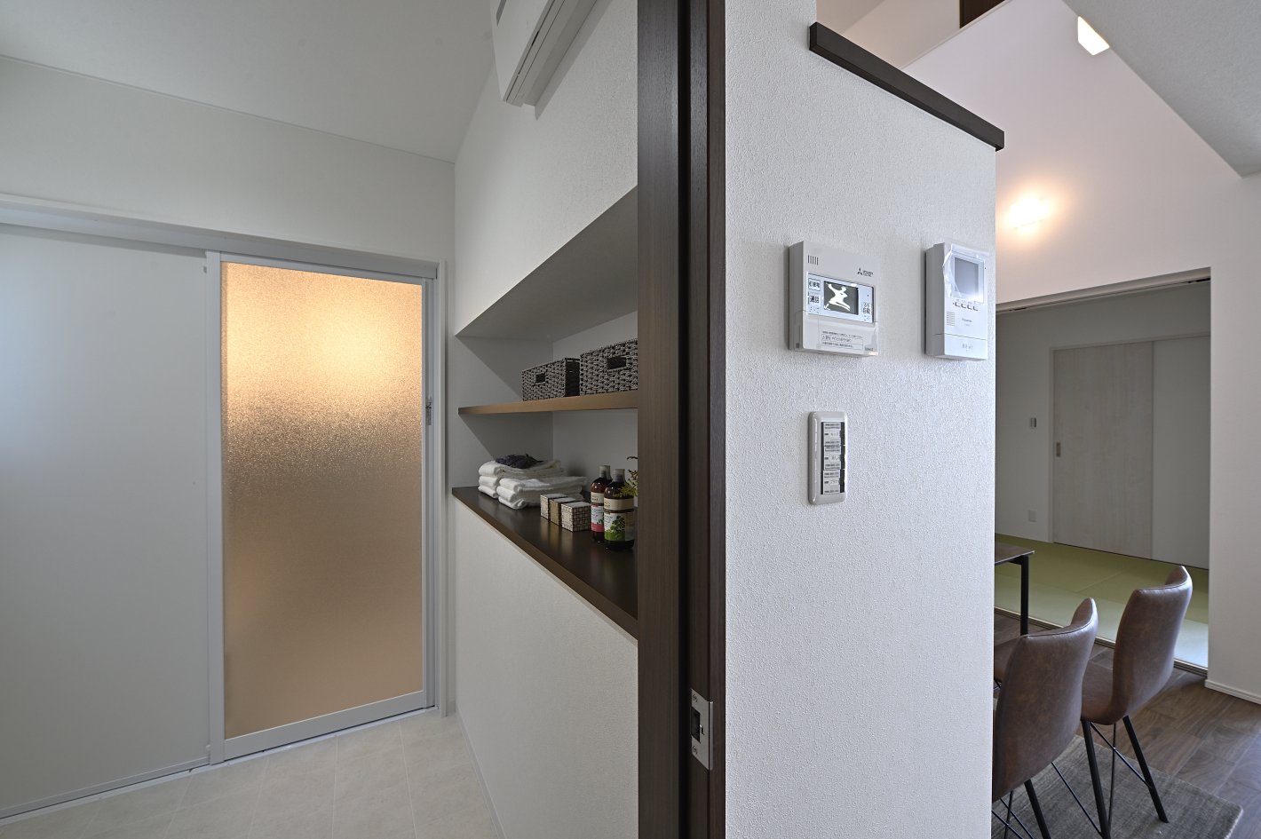 ダイニングにある収納は洗面側との両側収納になっており、スペースの有効活用かつLDKのアクセントとしていい雰囲気を作っています。