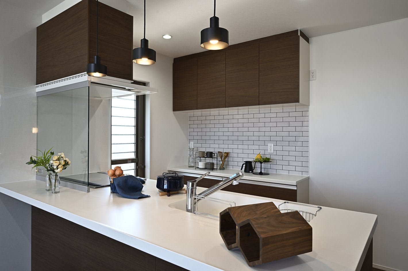 キッチンスペースは奥様に人気のペニンシュラキッチンやカップボード背面のタイルを施しています。キッチンからリビング、ダイニング、和室が見通せる配置は、家族との時間を大切にしたいという奥様のご希望を叶えています。