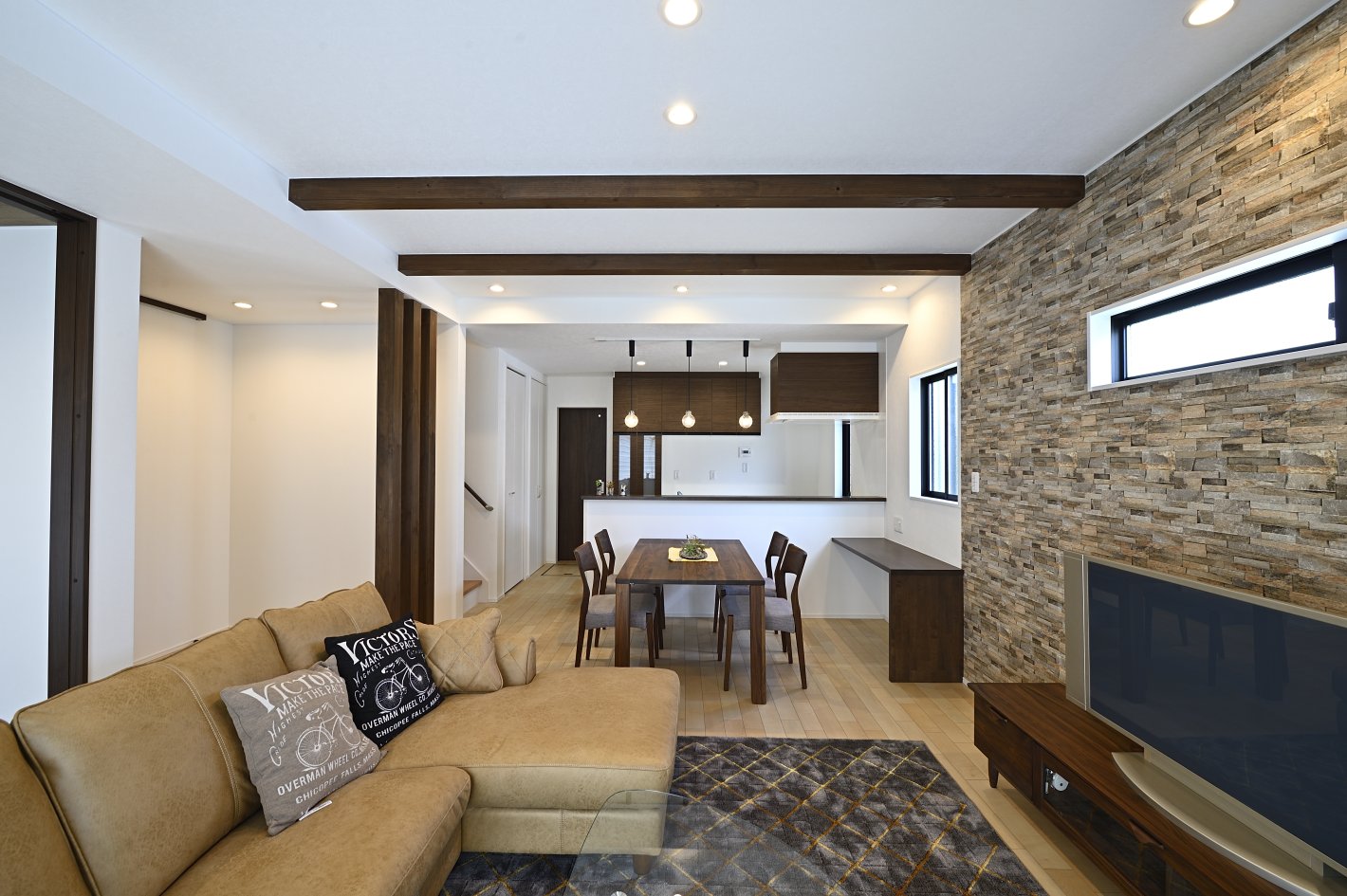 今回のテーマは「暮らしやすさ」です。ご家族皆様のご生活スタイルに合わせて間取りを考えた結果、回遊同線やウォークスルーのエントランスクロークなど子育て世代のお客様にあったらいいな”を詰め込んだようなお住まいとなっています。 外観はご主人こだわりのネイビーとミディアムウッドの外壁がスタイリッシュでオシャレなお住まいを演出しています。