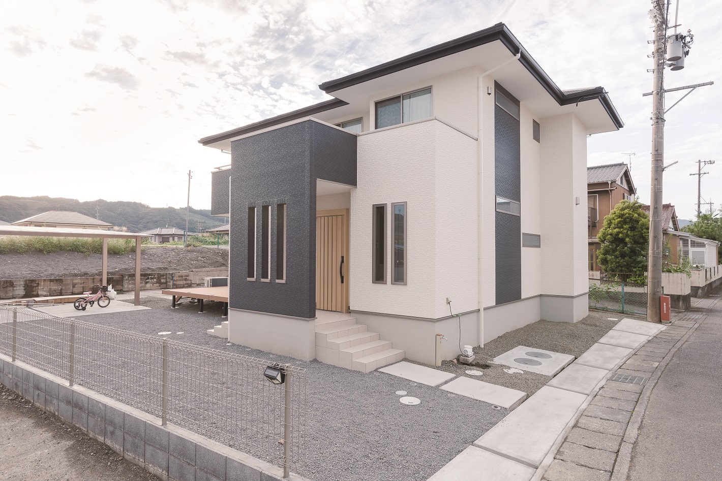 玄関ドアやウッドデッキの木の色がアクセントとなり、全体に温かみと柔らかい雰囲気をプラスしています。