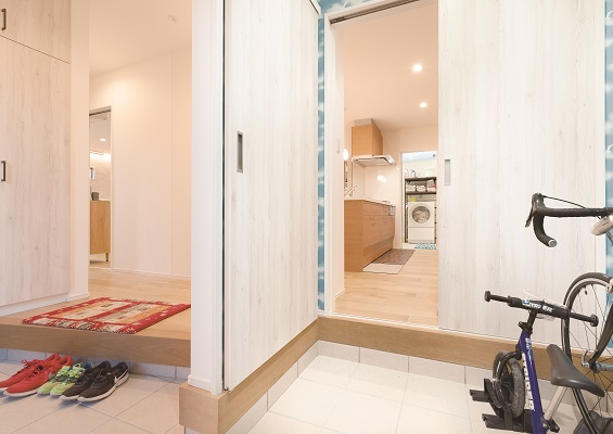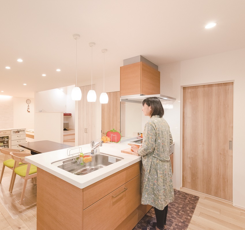 さらに、キッチンのすぐ横には洗面脱衣室へとつながる扉を設け、料理や洗濯などの家事を効率よくこなせる動線を実現しました。