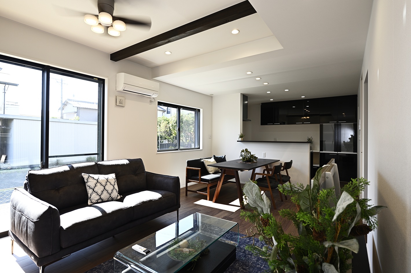 化粧梁の間にはシーリングファンを設けており、お洒落な落ち着いた空間を演出。