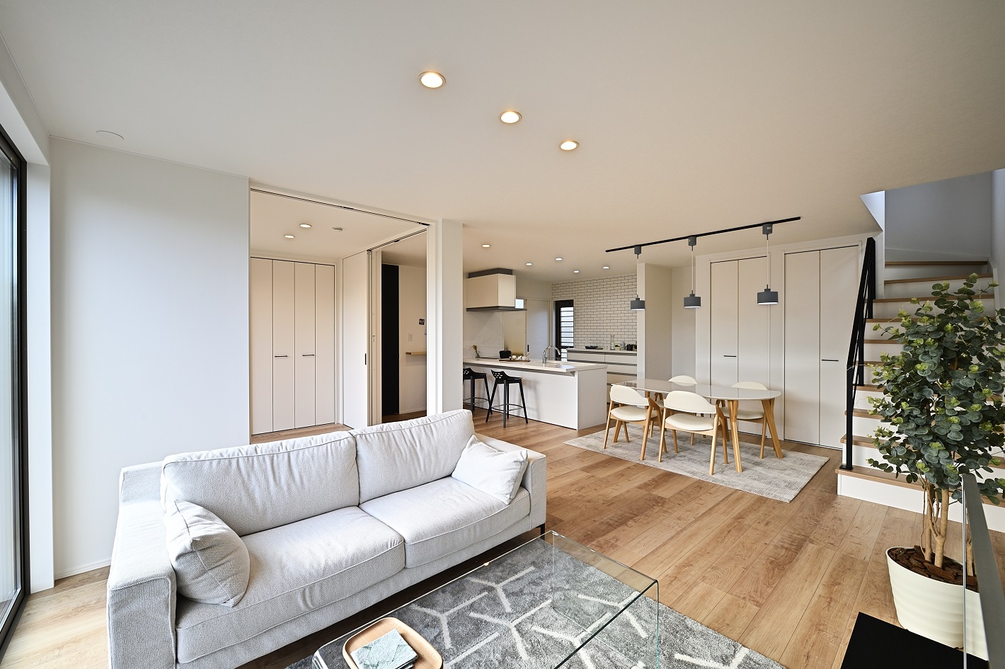 建具の高さ、サッシの高さを上げ、より解放感を感じることが出来る間取りです。南からの日当たりは抜群で、日中電気をを付けることなく生活ができます。