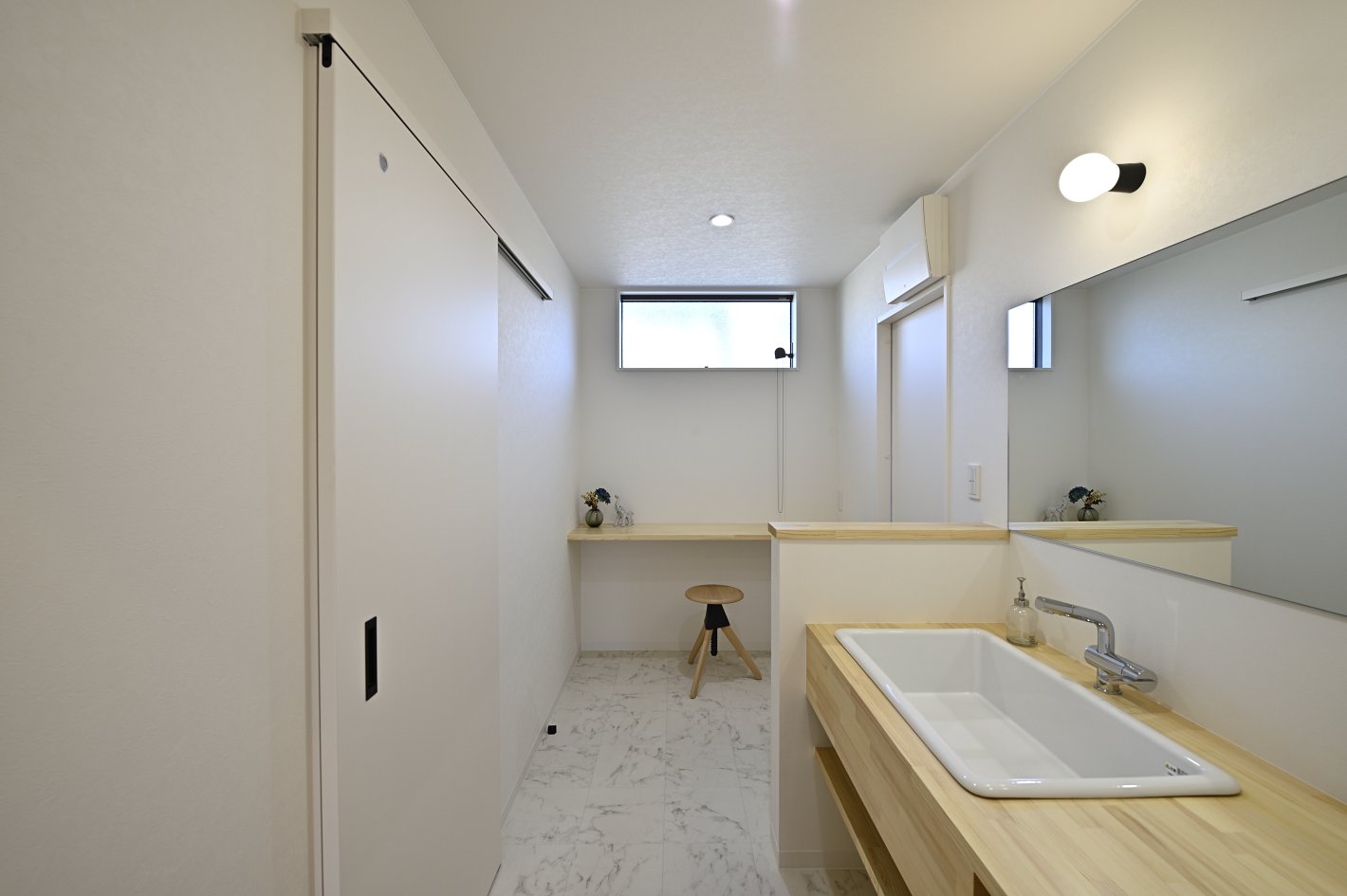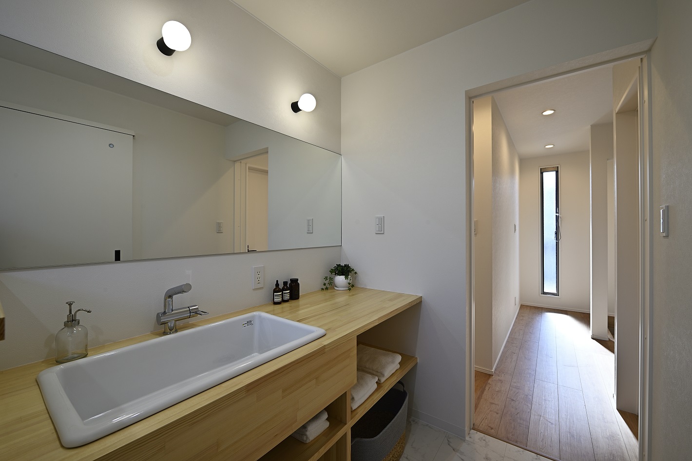 洗面所は4帖と広めに確保し、洗濯、干す、たたむ、アイロンがけまで一部屋で完了出来ます。