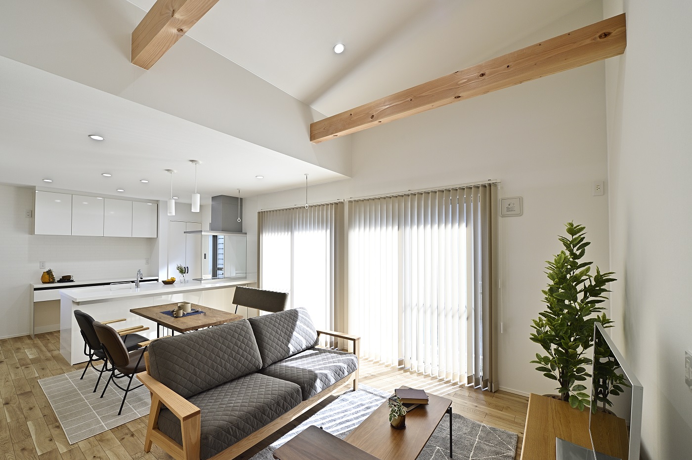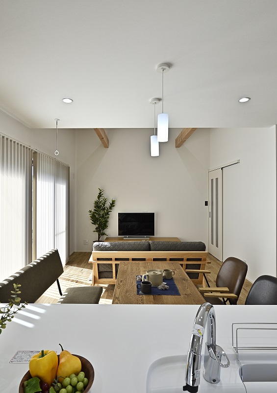 化粧梁がアクセントとなり、シンプルでありながらおしゃれで温かみのあるデザインを引き立てています。