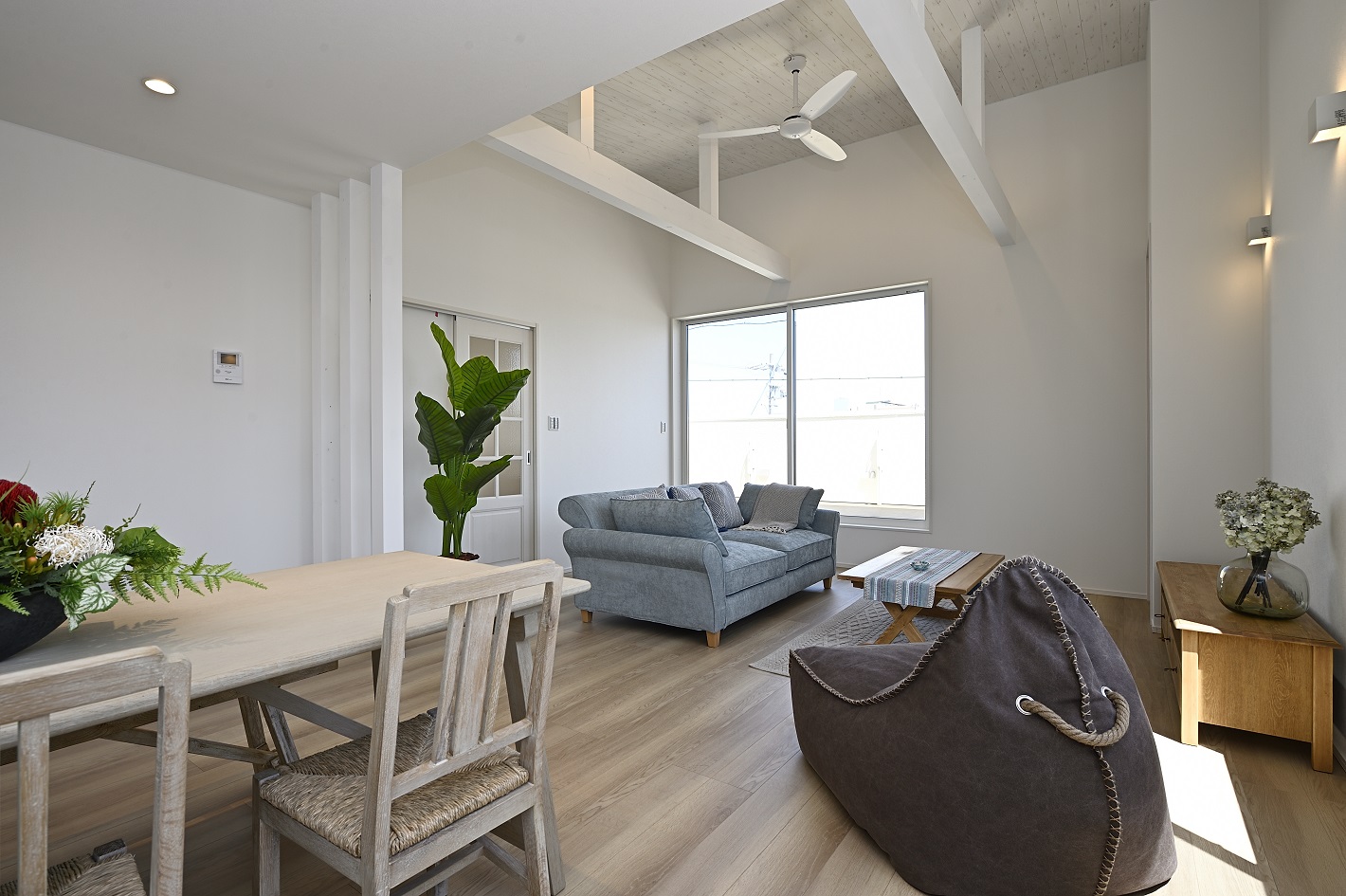 勾配天井が開放感を生み出し、ゆったりと回るシーリングファンを眺めているだけで、心も体も自然とリラックスできる空間に。 -