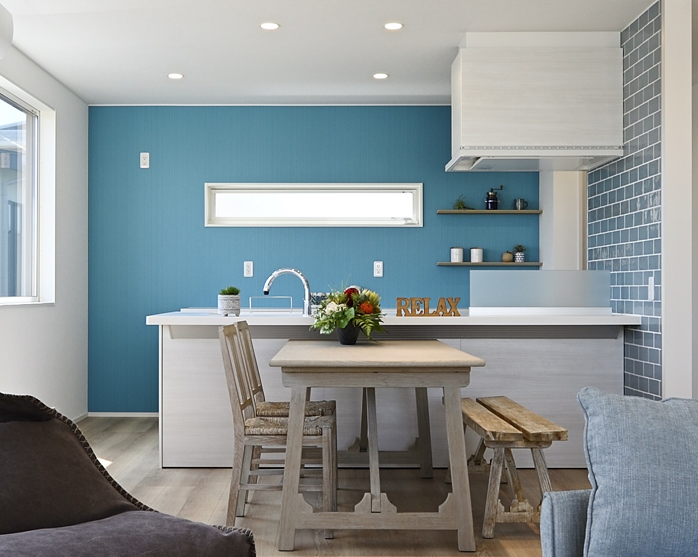 キッチンは、背面に爽やかなターコイズブルーを採用し、明るく個性的なアクセントをプラス。