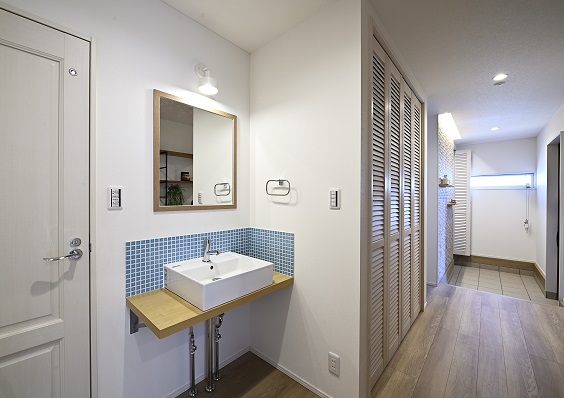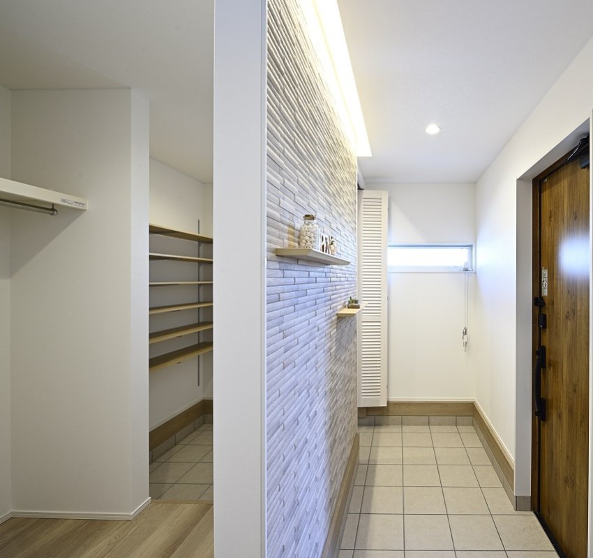 玄関扉を開けると、調湿・消臭効果のあるエコカラットの壁が迎えてくれます。