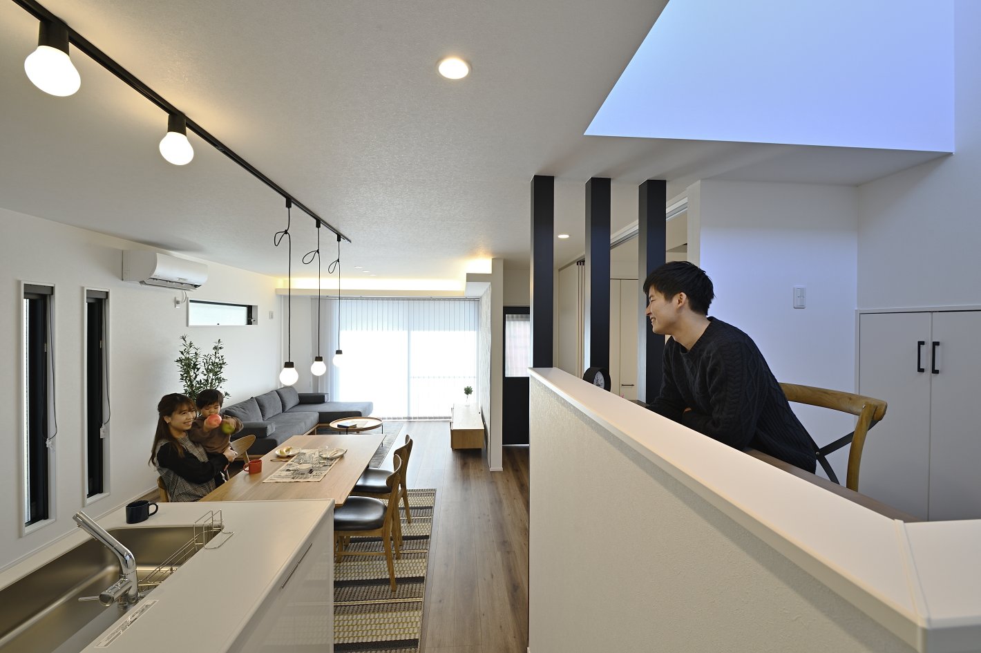 大きな窓やスキップフロアの吹き抜けによって、1階にも2階にもたっぷりと光が降り注ぎ、家族との団らんの時間をより明るく楽しいものにしてくれます。