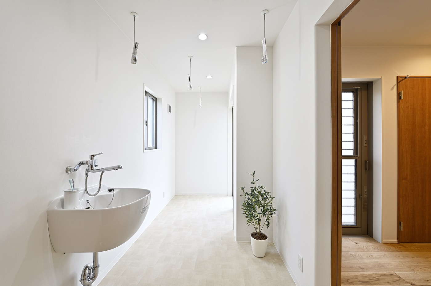 少しでも時間を大切にしたいというご要望にお応えし、朝の洗濯がスムーズに進むよう、洗面室に続くランドリールームを設けました。