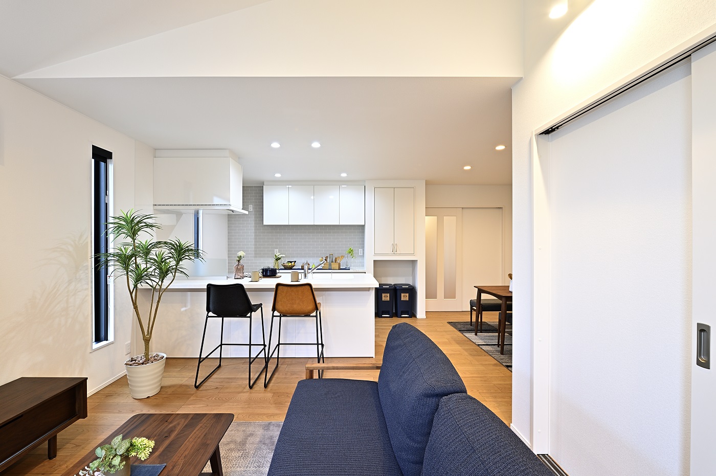リビングの天井は開放感を大切にし、勾配天井を採用しています。高く広がる天井は、部屋全体に空間的な余裕を生み出し、圧迫感を感じさせません。
