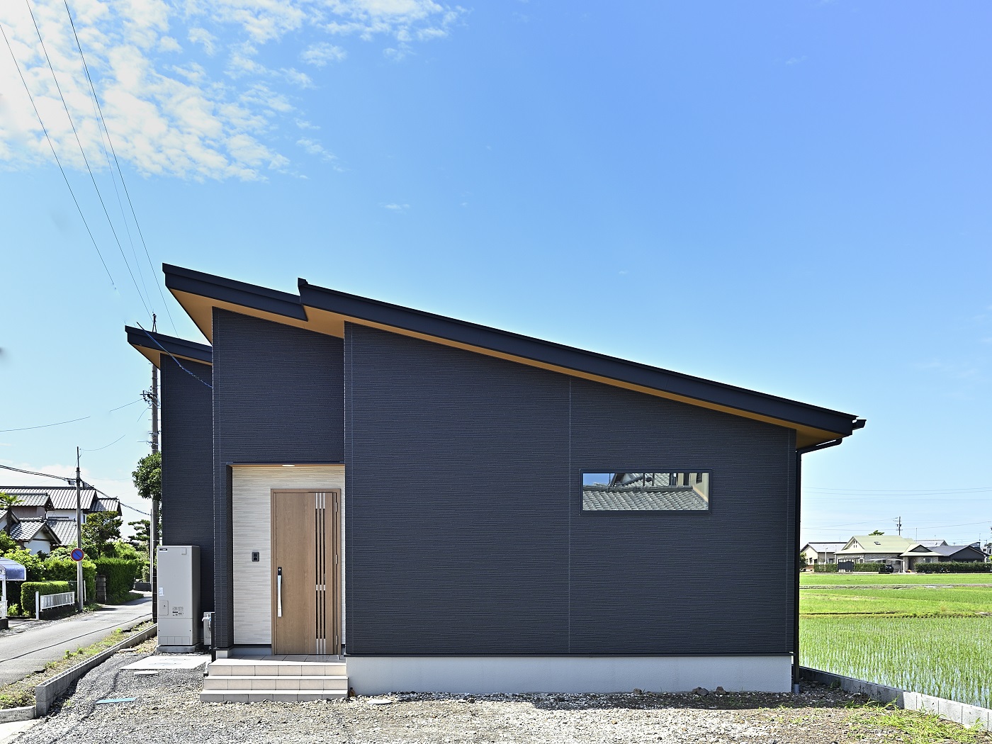 外観は、片流れ屋根のシルエットと、黒を基調にした外壁でスタイリッシュさを演出。