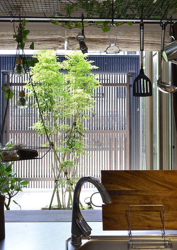 キッチンやリビングから眺められる中庭は、日常では洗濯スペースとして活躍し、家事の負担を軽減。