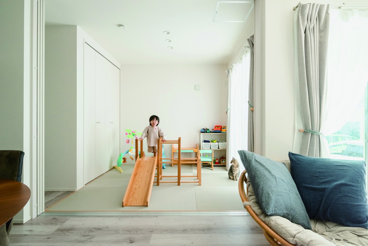 子供の遊び場の畳スペースは、キッチンから目が届くので安心。LDKとテイストを揃えることで、普段は開いて一体感を演出できます。