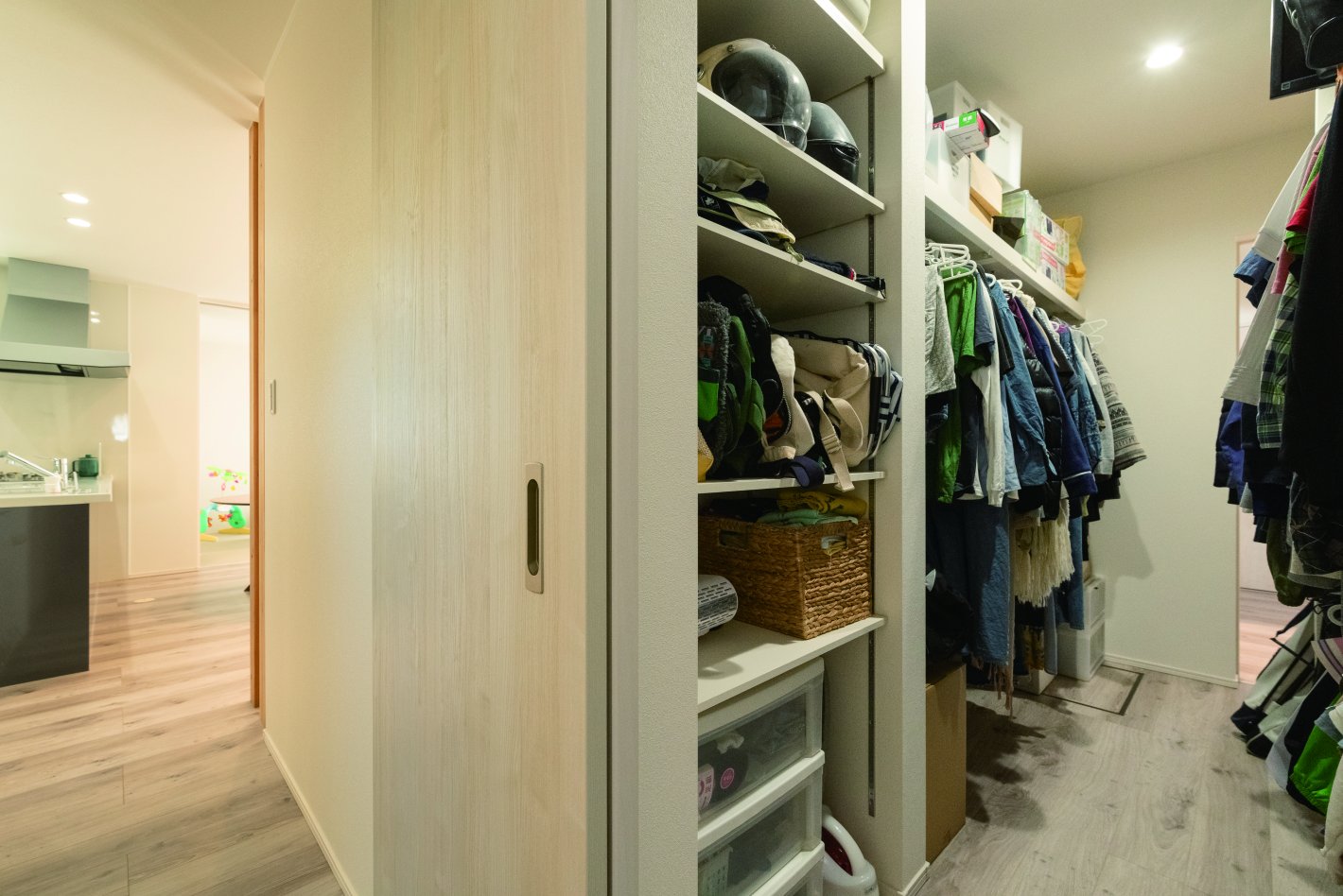 玄関には可動棚を備えた大容量のシューズクロークがあります。通り抜けるとそのままファミリークローゼットに連続します。