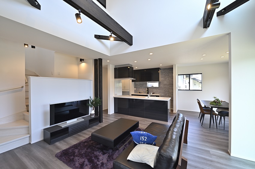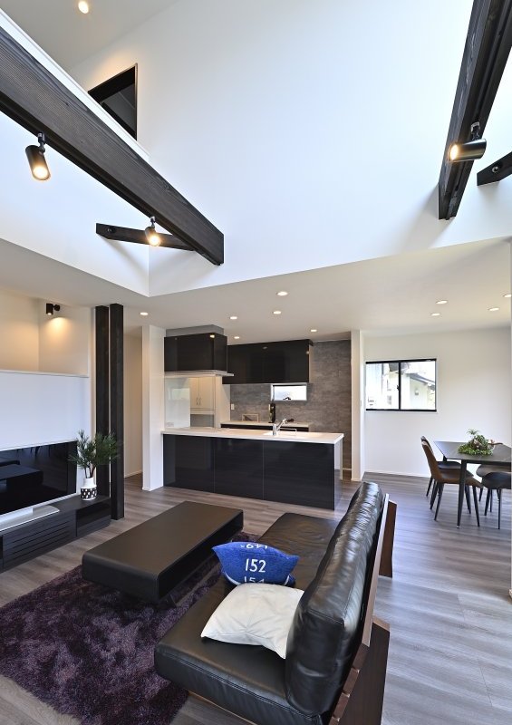 LDKは、21.3帖の広さに加えて吹き抜けとスキップフロアがあります。この部分は開放感を求めたご夫婦自慢の空間になっております。