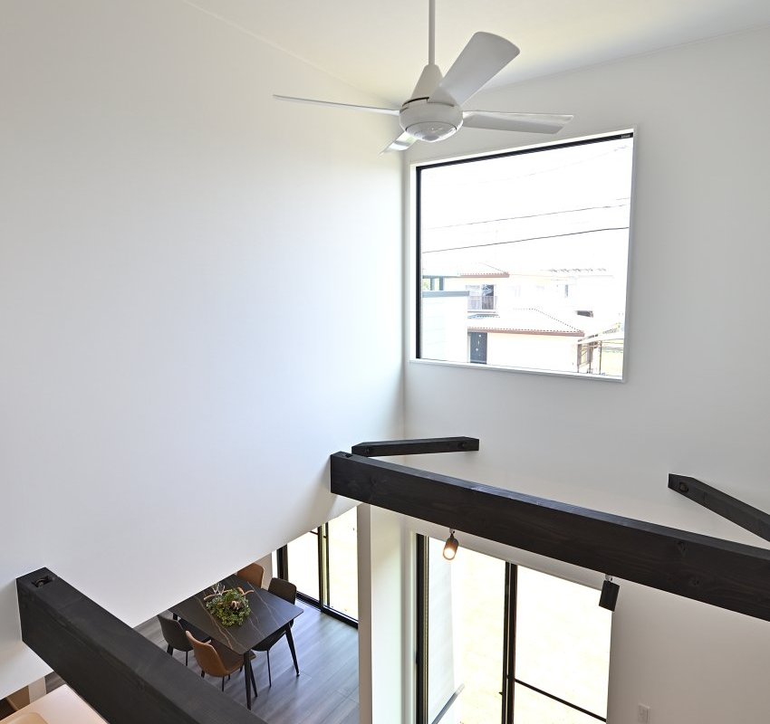 吹き抜けの南面についた窓から光を取り入れることで、お家全体と家族も明るくなります。