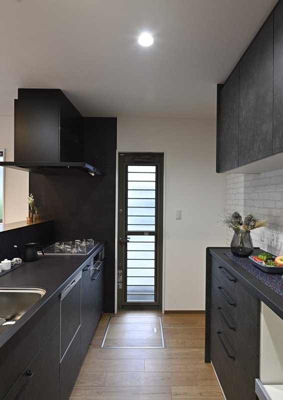 勝手口にも出られて、壁に取り付けられた背面収納も容量たっぷりなのでキッチンが散らかりません。