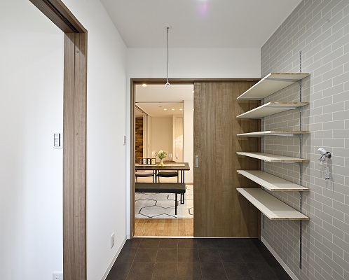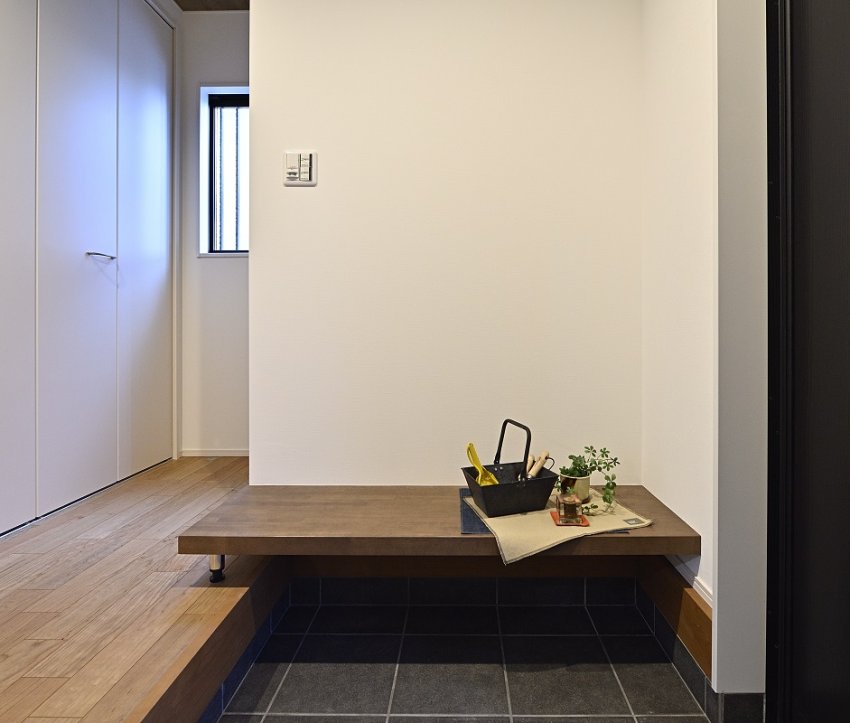 玄関のベンチスペースは買い物の荷物を置くにも、お子様が靴を履くにも便利なお施主様のこだわりポイントです。