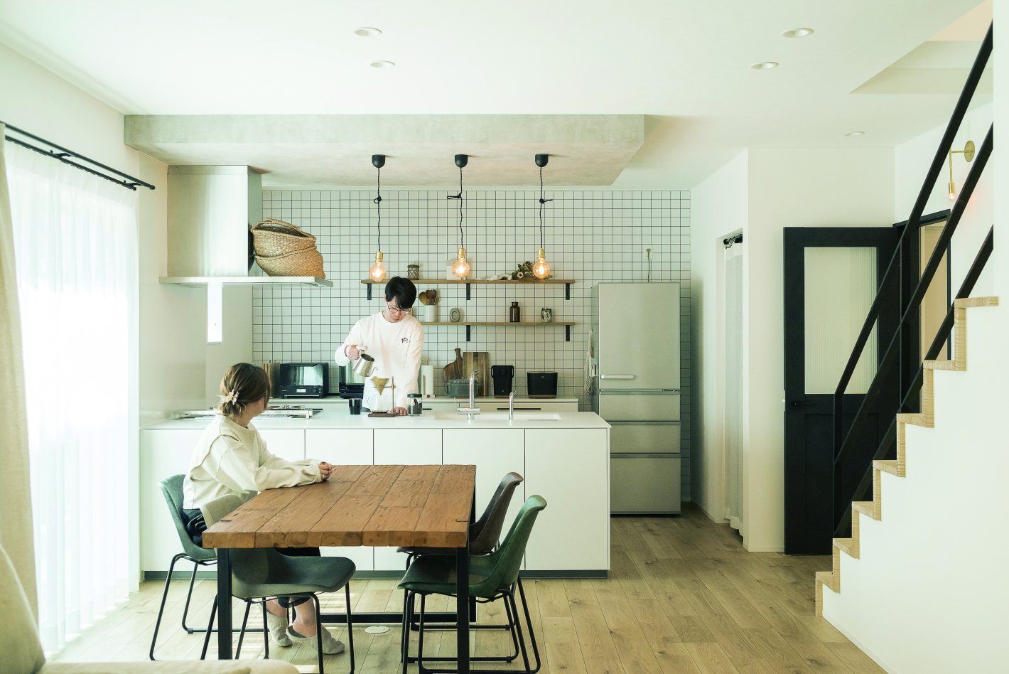 右手は可動棚とマグネットボードを備えたパントリーで、そのまま玄関へと通り抜けられるようになっています。階段はデザイン性にも配慮。踏み板と蹴込み板を無垢仕立てとし、サイドからの見栄えも大切にしました。 -