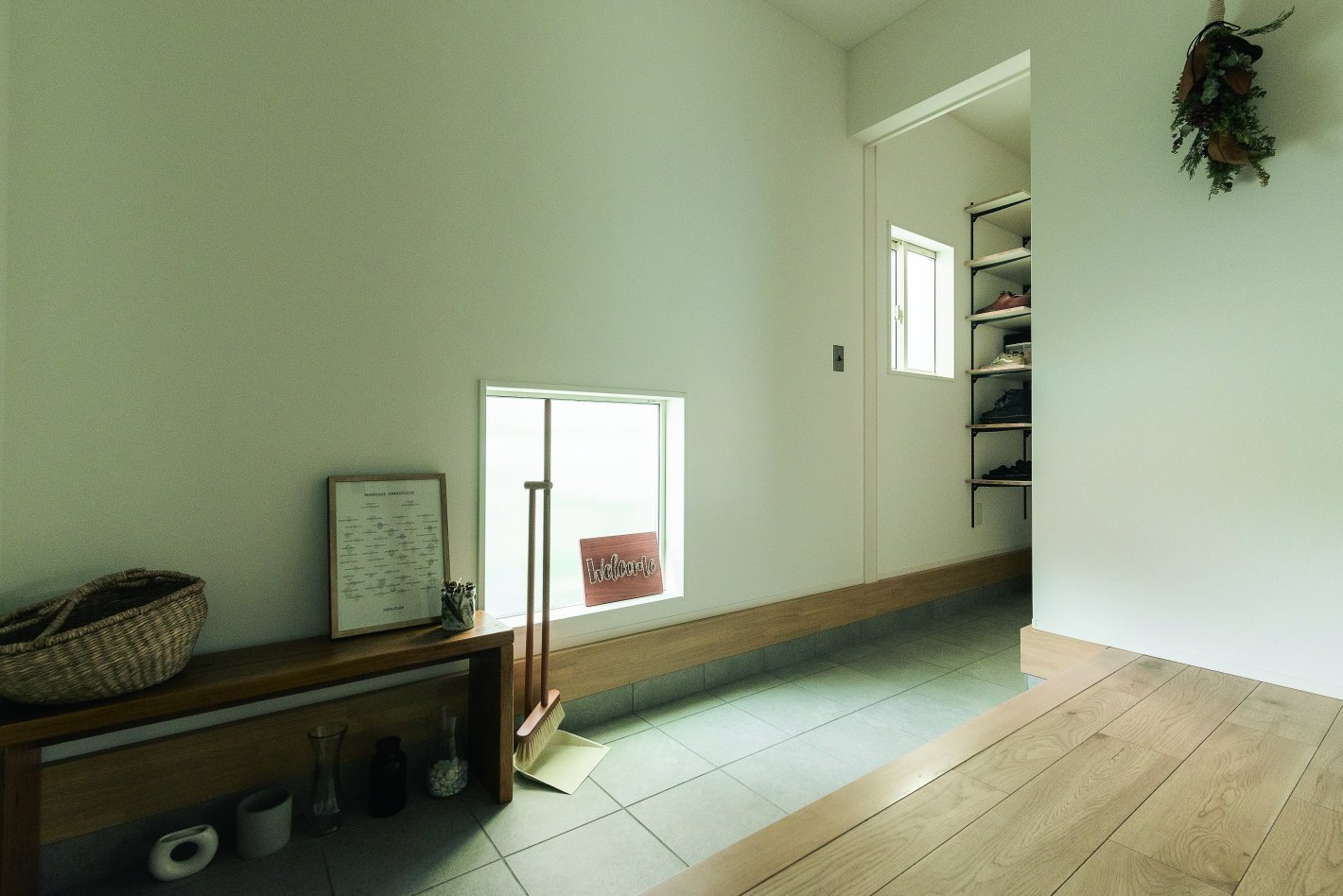 ナチュラルで明るい玄関。家族用の玄関をシューズクロークの先に設えました。